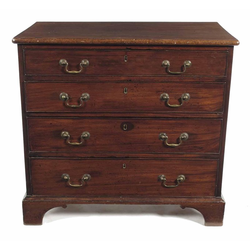 A small mahogany chest, with four long graduated drawers fitted replaced brass handles, 31.25in (79.5cm) h, 33.5in (85cm) w, 19.25in (49cm) d.