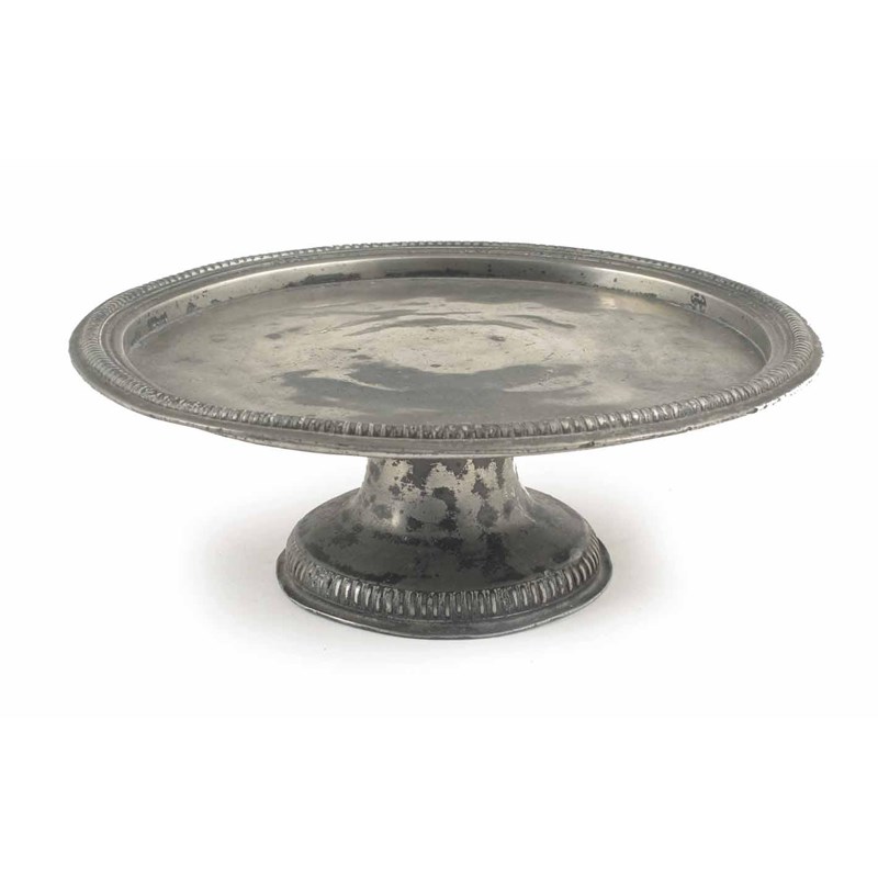 An early 18th century pewter footed plate or tazza, raised on a gadrooned edge spreading foot to a deep edge top with a gadrooned rim, touchmark struck twice to underside, very faint, possibly Thomas Forde, Whitehaven (Cott 1723,) scratched inventory number '123' inside the foot, 3in (7.5cm) h, 8.5in (21.5cm) dia.