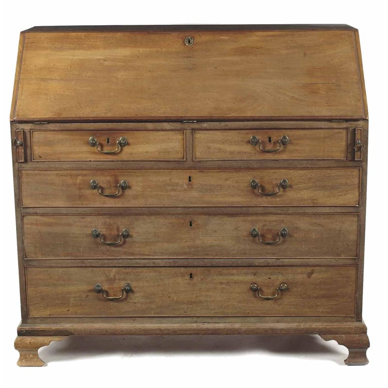 A George III mahogany bureau, the interior with a cupboard door flanked by a pair of faux fluted and parquetry secret pilasters, pigeon holes and drawers, above two short and three long graduated drawers fitted original brass handles, on ogee bracket feet, 42.5in (108cm) h, 46in (117cm) w, 22in (56cm) d.