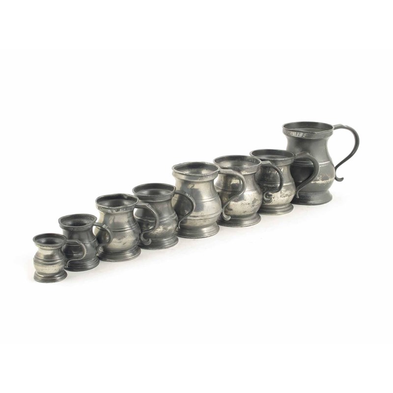 Eight pewter baluster measures, comprising: pint; three ½ pints; a ¼ pint and a gill; a ½ gill and a ¼ gill, all 19th century. (8)