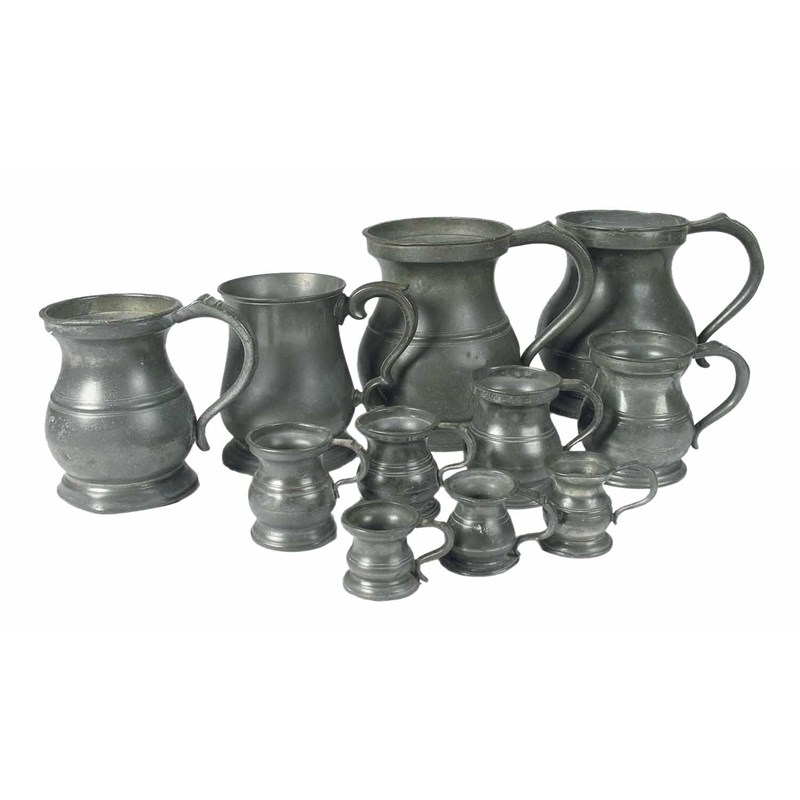 A group of fifteen pewter baluster measures, including quart (3), pint (2), 1/2 pint (2), 1/4 pint (1), gill (2), 1/2 gill (2), 1/4 gill (1), and two others stamped '20' and '24'. (15)