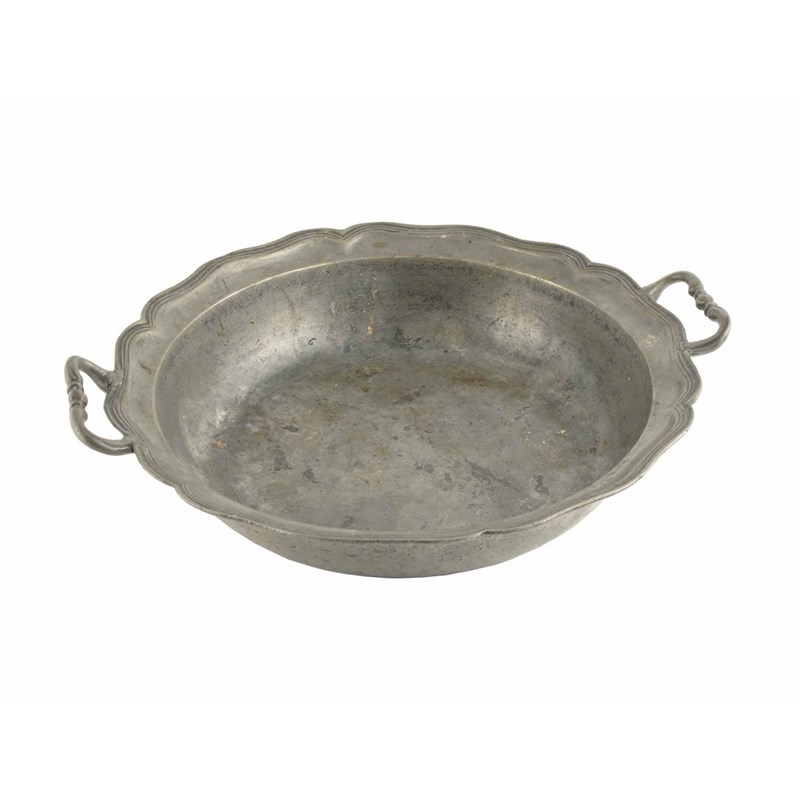 A French pewter two handled bowl, with a shaped reeded edge, indistinct 'crown' mark to underside and owners initials 'I , G', 12.25in (31cm) dia.