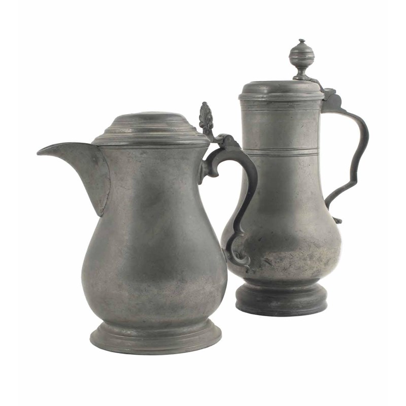 A North European pewter flagon, with a ball thumbpiece and a double scroll handle, the pear shape body with an ogee foot, 13.25in (33.5cm) h., a 19th century pewter lidded jug, with a shell thumbpiece, touchmark an 'eagle?', 10.25in (26cm) h. (2)