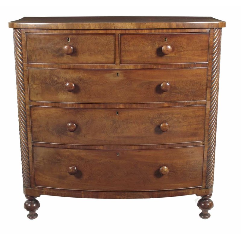 A Victorian mahogany bowfront chest, the drawers fitted wood knob handles flanked by spiral ribbed quarter pilasters on turned mushroom feet, 45.5in (115.5cm) h, 46in (117cm) w, 25.5in (57cm) d.