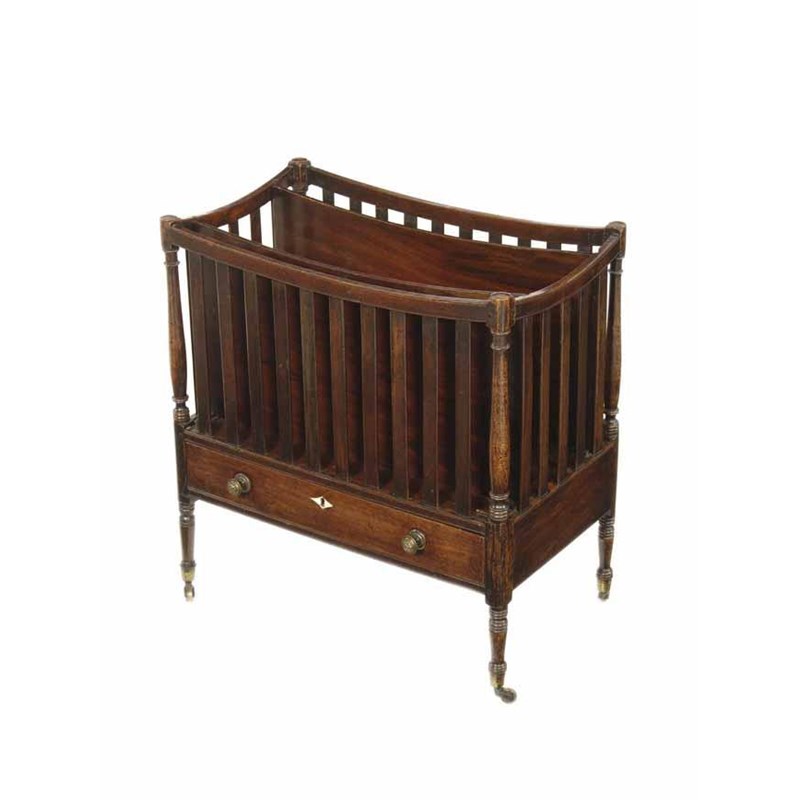 A 19th century mahogany Canterbury, with two pull-out solid dipped divisions, slatted front and sides, a frieze drawer and on turned supports, one replaced, to brass castors, 21.5in (54.5cm) h, 20.5in (52cm) w, 12in (30.5cm) d. This piece has an unusual pegged construction, possibly continental.