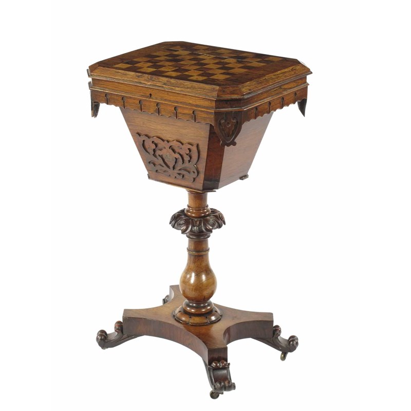 A William IV rosewood work table, the hinged top inlaid a chequer board to a vacant interior, originally with a lift-out tray, with fret work and foliate carved decoration to a quartreform base, scroll feet and brass castors, 29.25in (74.2cm) h, 17.25in (43.8cm) w, 14.25in (36.4cm) d. Splits to top, some losses.
