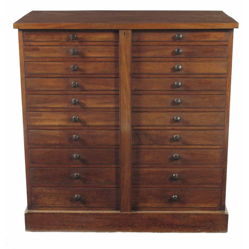 A late Victorian mahogany collector's chest, with twenty short graduated drawers fitted a central ebonised wood handle, having a central locking bar, 37in (94cm) h, 36.25in (92cm) w, 19.5in (49.5cm) d.