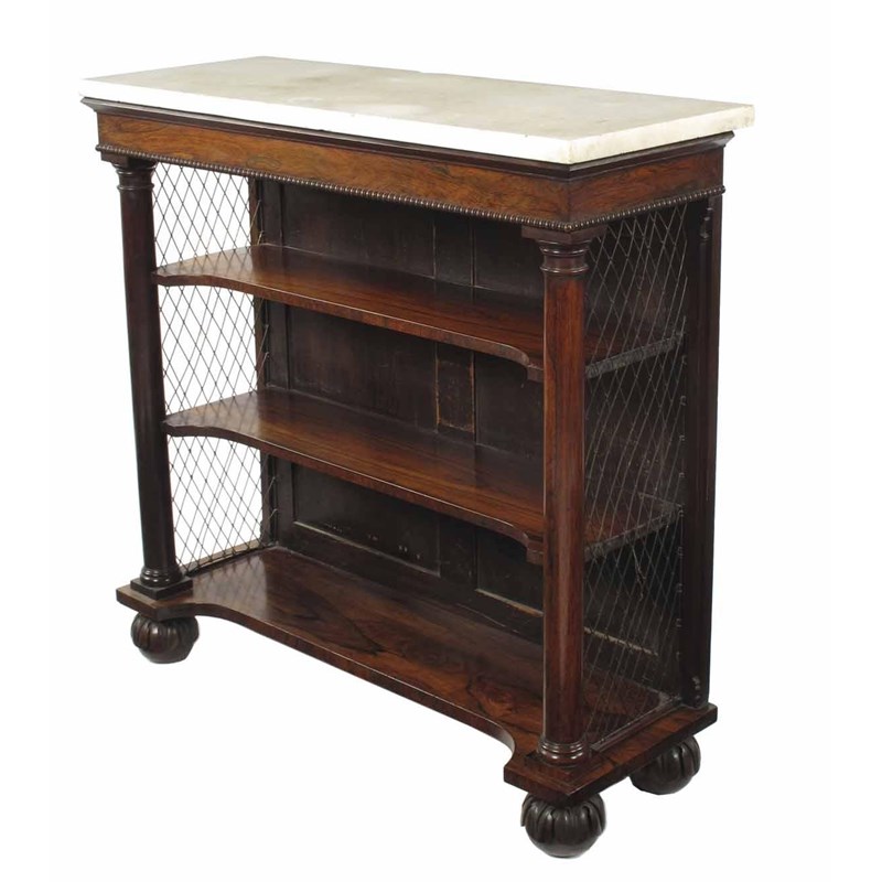 A George IV rosewood bookcase, the white marble rectangular top above a reel moulded frieze and three concave front shelves with turned column supports and brass grille sides on petal carved and turned bun feet, 35.25in (89.5cm) h, 36.25in (92cm) w, 13.5in (34.5cm) d.