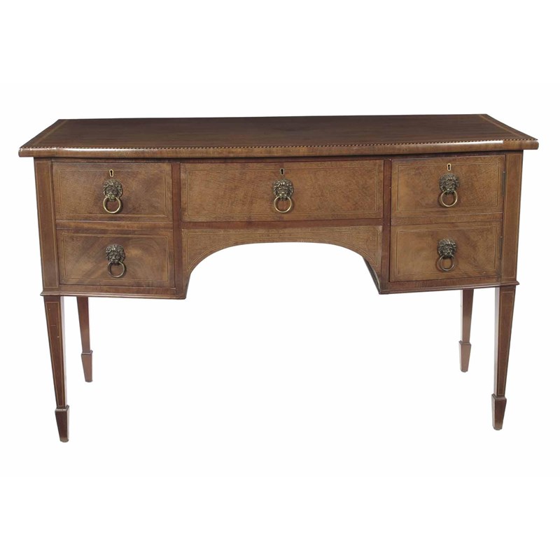 An Edwardian mahogany barrel front sideboard, with satinwood banding and barber's pole stringing to the top, the front with boxwood and ebonised stringing, with a central frieze drawer flanked by a deep drawer with a lift-out cutlery tray and a cupboard door enclosing a shelf, fitted brass lion's mask ring handles, 34.5in (87.5cm) h, 54.25in (136cm) w, 24in (61cm) d.
