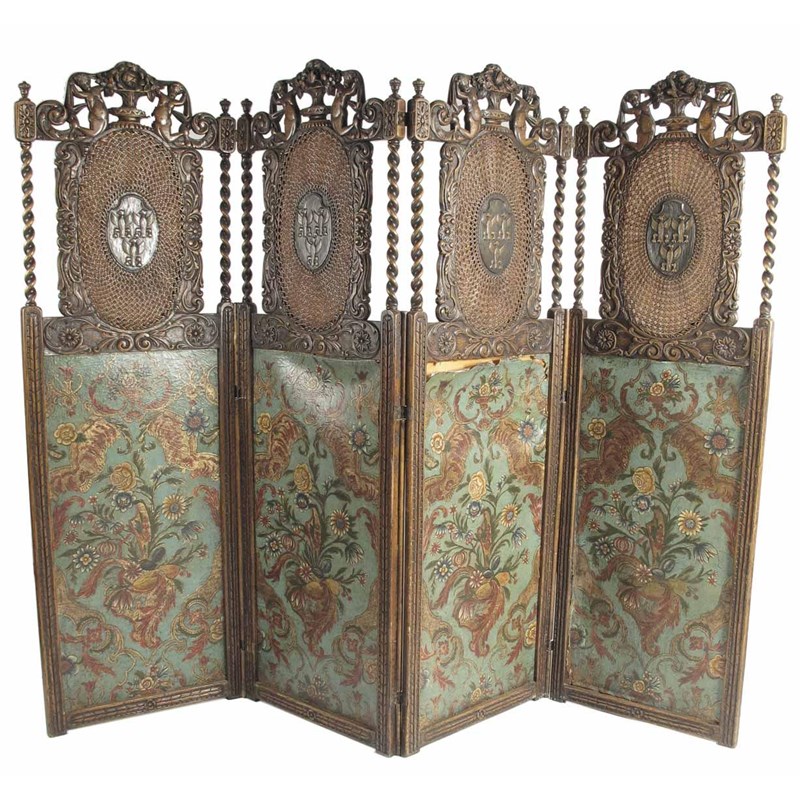 A carved oak and Spanish leather type four fold screen, with putti flanking a vase surmount above a caned panel with a triple eagle crest to turquoise ground painted panels, 71.5in (181.5cm) h, 23in (58.5cm) w, each panel.