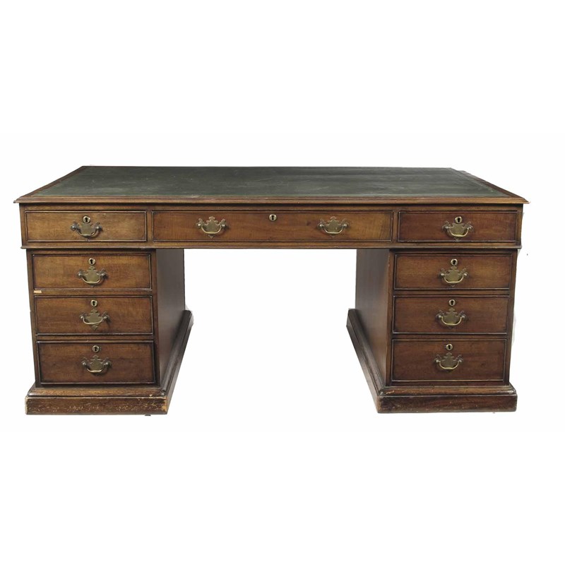 A mahogany twin pedestal partner's desk, the later inset gilt tooled leather top above three frieze drawers to either side, with three graduated drawers to each pedestal fitted later brass plate handles, with cupboards to the reverse, 2nd quarter 19th century and later, 29in (73.4cm) h, 65.25in (165.6cm) w, 39.75in (100.7cm) d. Restoration and replacements.