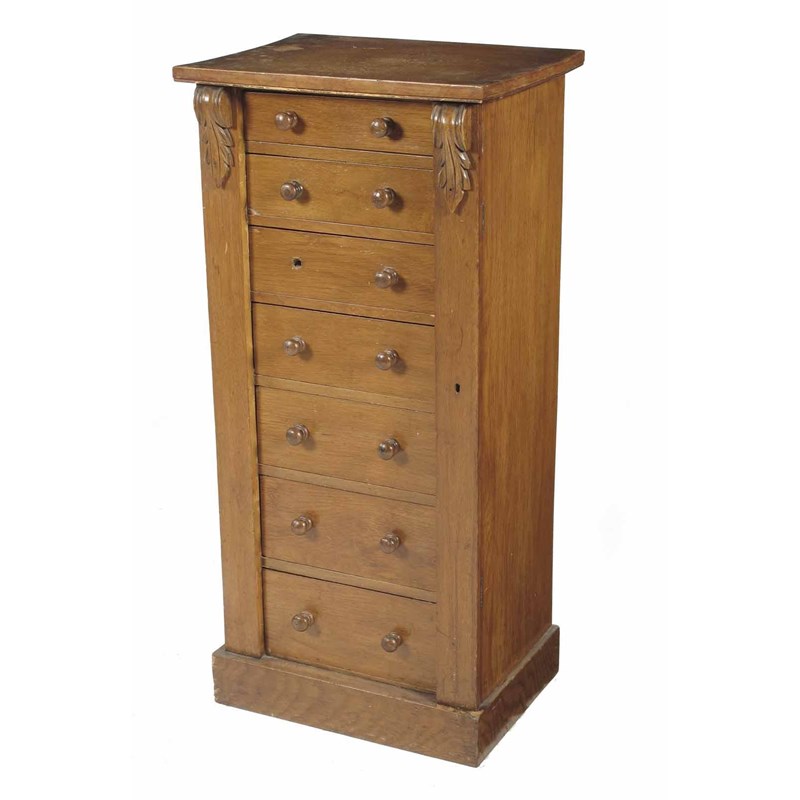 A Victorian oak Wellington chest, of seven graduated drawers, 39.75in (101cm) h, 19in (48.2cm) w, 13.5in (34.1cm) d. One handle missing.