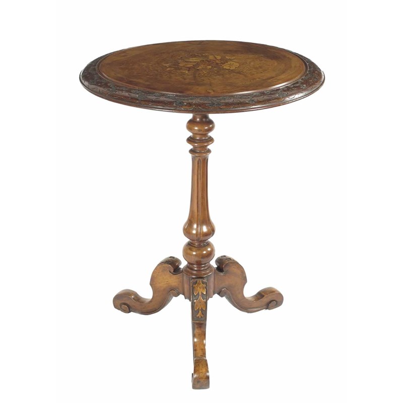 A Victorian walnut tripod table, the circular top inlaid a central marquetry floral spray to a leaf carved edge, 29in (73.5cm) h, 22.75in (58cm) dia.