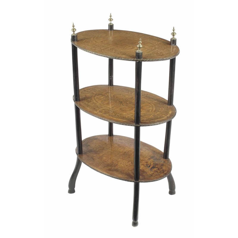 A late 19th century French three tier etagere, with rosewood and satinwood marquetry oval tiers, ebonised supports and gilt brass mounts, 32.5in (82.5cm) h, 19.75in (50cm) w, 13.5in (34cm) d.