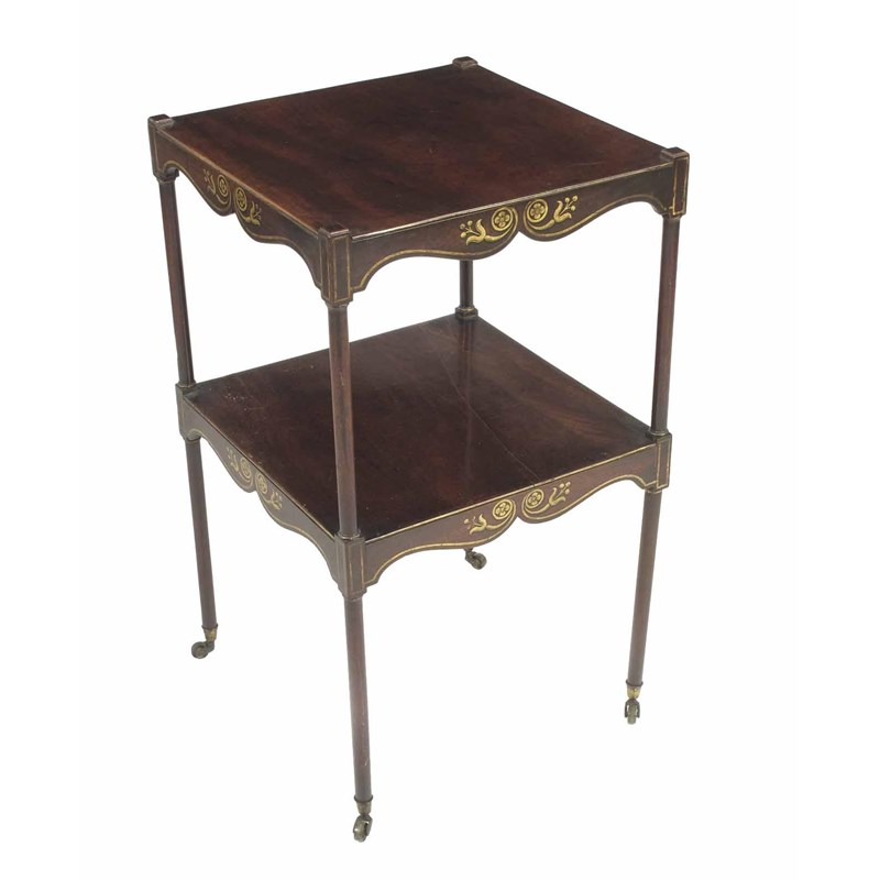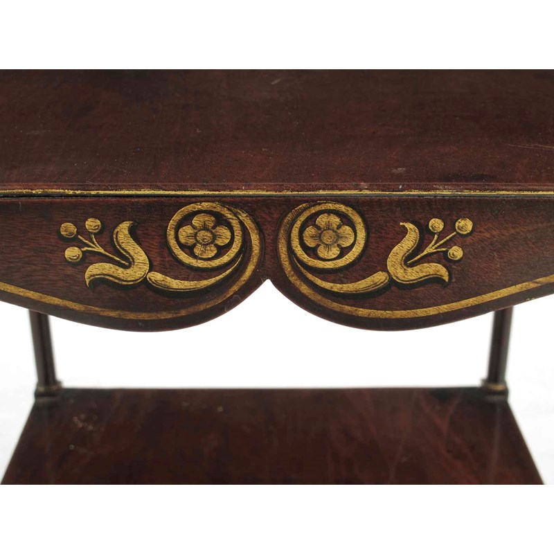 An early 19th century mahogany two tier etagere, with arc d'arbelet friezes with painted gilt highlights with turned supports on brass castors, 29in (73.5cm) h, 16.5in (42cm) w and d.