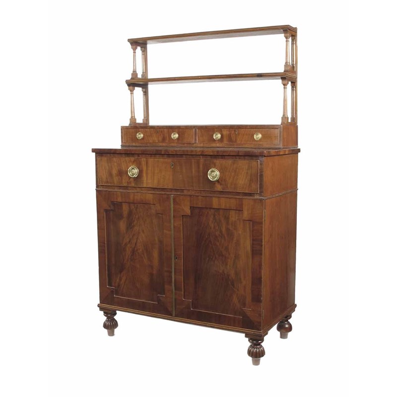 A mahogany chiffonier, the later open shelved top above a box base fitted two cedar lined drawers to a single frieze drawer and a pair of panelled doors enclosing a shelf on lobed mushroom supports, George IV and later, 62.5in (158.7cm) h, 37in (93.8cm) w, 18.75in (47.5cm) d.