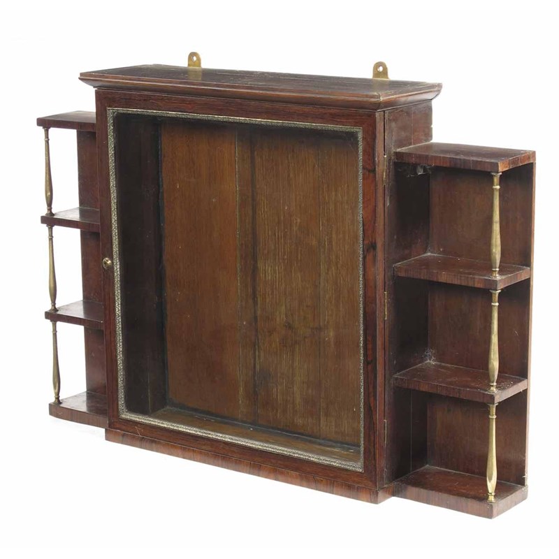 A late 19th century rosewood and brass mounted wall cabinet, the central glazed door previously enclosing two shelves, flanked by open shelves with slender baluster supports, 26in (66cm) h, 37.5in (95cm) w, 7in (18cm) d.
