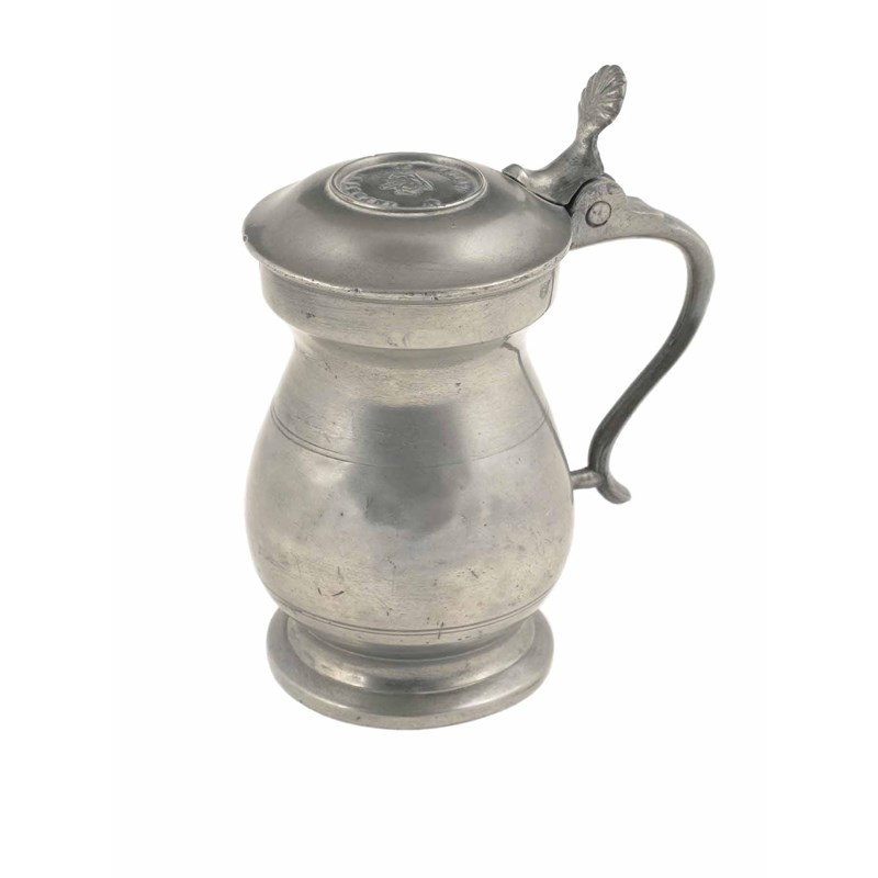 A Scottish pewter baluster measure, Imperial half pint, with a shell thumbpiece, Glasgow town mark, 5.5in (14cm) h.