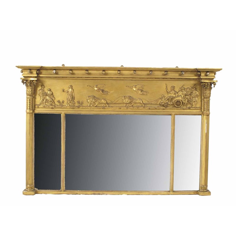 A Victorian giltwood and gesso landscape overmantle mirror, the three bevelled plates above a frieze decorated a chariot being pulled by lions with figures and trumpeting angels, flanked by Corinthian capped pilasters to a ball applied cornice, 35.5 x 56in (90 x 142cm).