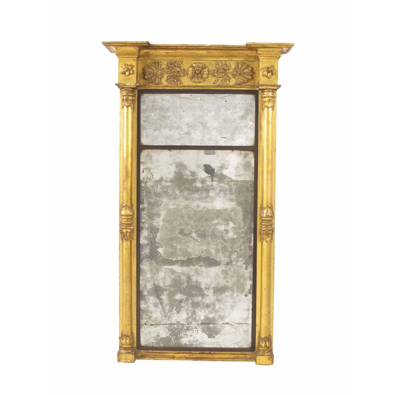 A 19th century giltwood and gesso pier mirror, with a rectangular bevelled plate above a plain plate, floret and anthemion decorated frieze flanked by petal capped pilasters, 43 x 25in (109 x 63.5cm).