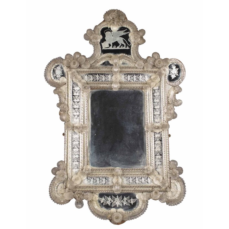 A 19th century Venetian wall mirror, with a rectangular bevelled plate to floral engraved borders and spiral twist mounts, with a conforming shaped outer framing, 57 x 37in (145 x 94cm).