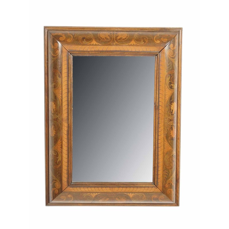 A Dutch cushion frame and marquetry wall mirror, with a rectangular bevelled plate to a walnut ground with scrolling foliage, 24.5in (62cm) h, 18.5in (47cm) w.