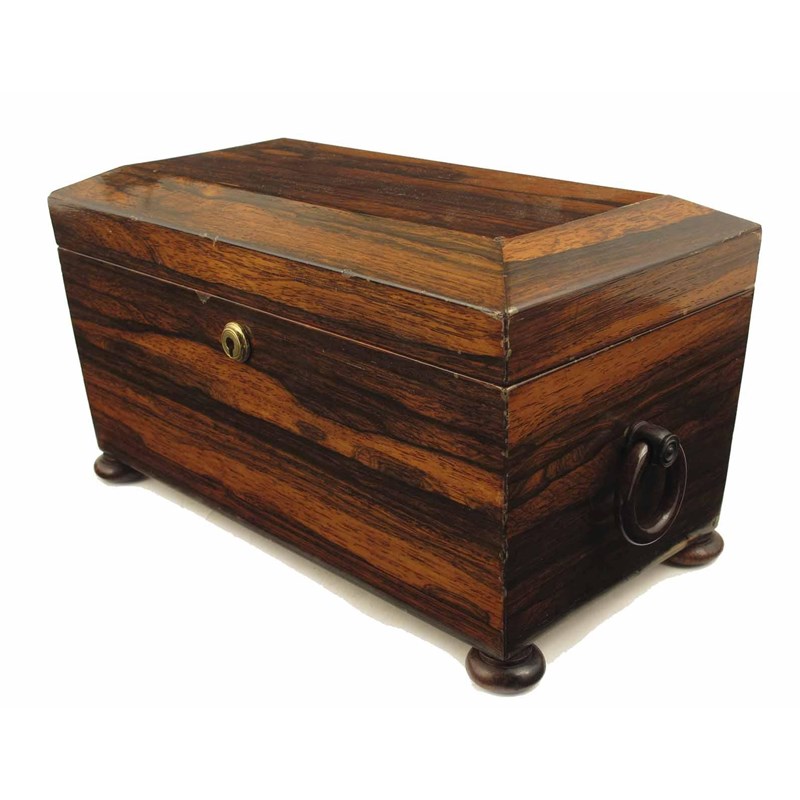 A Victorian rosewood sarcophagus tea chest, raised on flattened bun feet and with ring side handles, with a pair of hinged lid containers flanking a later glass bowl, 7.25in (18cm) h, 14.5in (37cm) w.