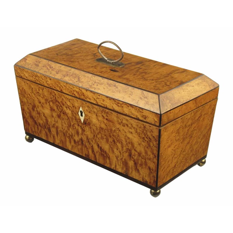 A William IV bird's eye maple sarcophagus shape tea caddy