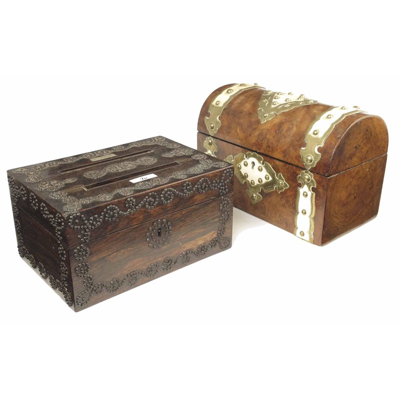 A 19th century rosewood and steel studded letter box, the hinged lid with two pierced apertures, each titled one on mother of pearl and inscribed 'Answered' the other replaced with bone 'In', to a divided interior, 4.5in (11cm) h, 8.5in (21.7cm) w, together with a Victorian walnut, brass and ivory mounted domed box, interior lacking. (2)