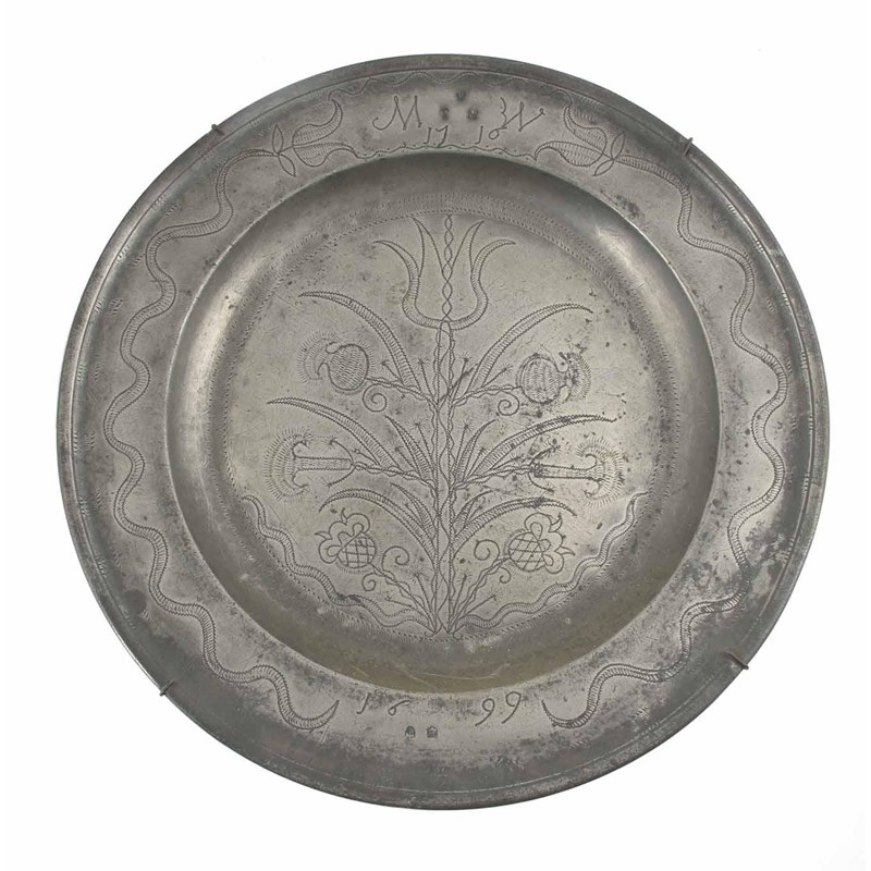 A George I wrigglework pewter charger, circa 1716, by Timothy Fly, London, the centre decorated a stylized tulip, the rim with owner triad 'W over TM flanked by MW 1716', within a cartouche issuing trailing tulips and terminating with '1699', lion hallmarks, touch mark to reverse (Cott 1704), 18in (46cm) dia.