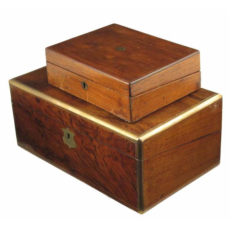A late Victorian walnut and brass mounted writing slope, 6.75in (17cm) h, 16in (40.5cm) w, 9.75in (25cm) d., and a late Victorian child's mahogany writing slope, 10.25in (26cm) w. (2)