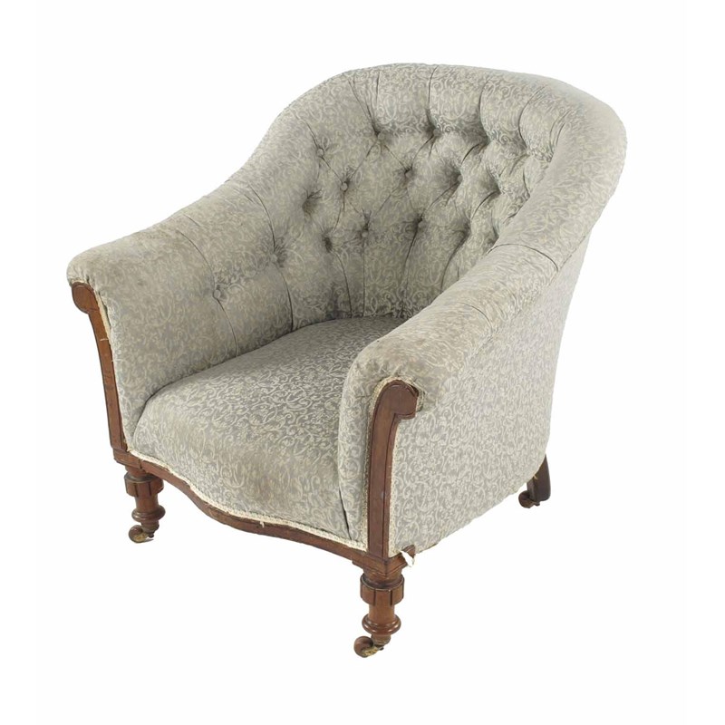 A late Victorian easy armchair, button upholstered with walnut scroll front supports with turned front legs.