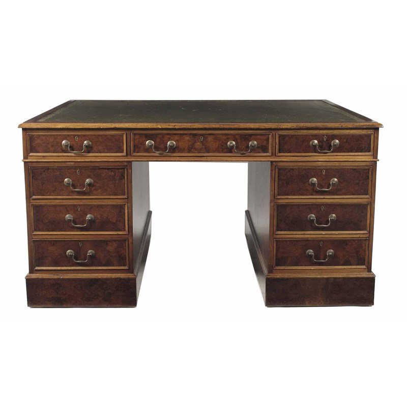 A walnut twin pedestal partner's desk, the rectangular top inset gilt tooled green leather, above three frieze drawers and three drawers to each pedestal, the reverse with three drawers above cupboards, mid 20th century, 31in (78.6cm) h, 58in (147.3cm) w, 43.5in (110.2cm) d.