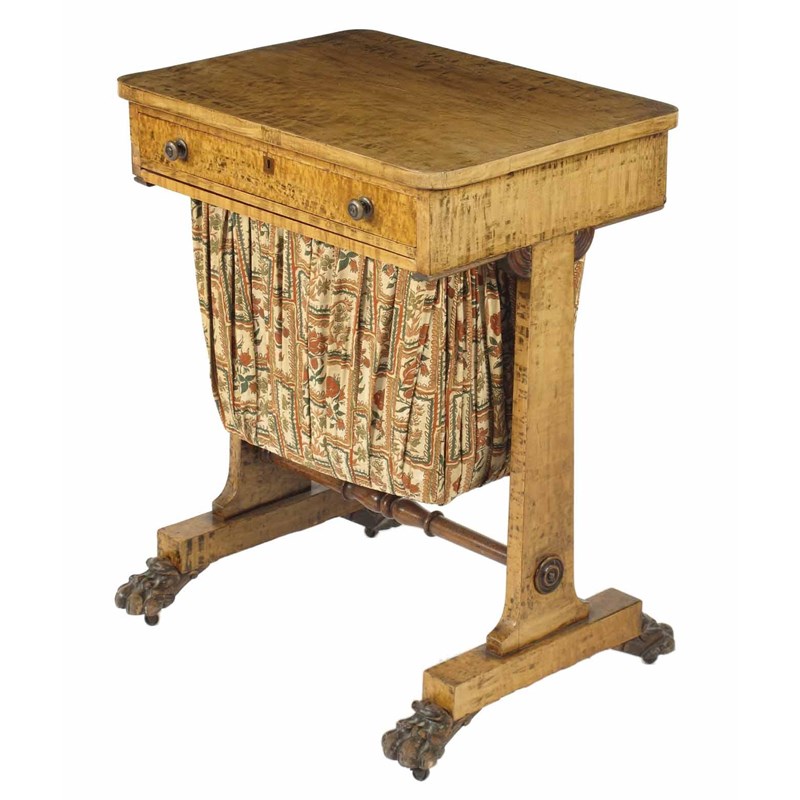 An early Victorian bird's eye maple work table, with a divided frieze drawer and pull-out bag, with tapering trestle end supports and reeded quarter brackets united by a turned stretcher, the platforms with ebonised carved paw feet on iron castors, 27.5in (70cm) h, 21.5in (54.5cm) w, 17.5in (44.5cm) d.
