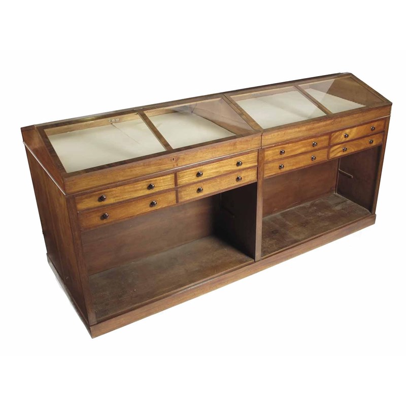 A Victorian mahogany museum display cabinet, the top with four hinged and glazed lift-up doors, above eight frieze drawers and two open folio recesses to each side, on a plinth base, 46.5in (118cm) h, 97in (246.3cm) w, 36.5in (92.5cm) d.