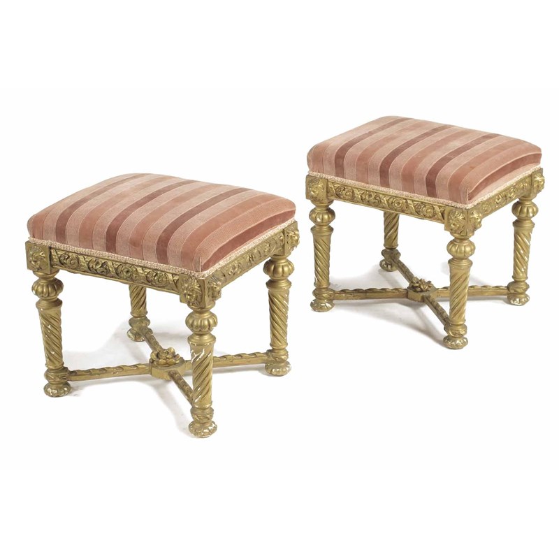 A pair of 19th century giltwood and gesso rectangular stools, the upholstered seats with ribbon and foliage friezes, with lion mask headed ribbed and spiral fluted legs united by an 'X' stretcher with a central floret, 17in (43cm) h, 18in (46cm) w, 15.5in (39.5cm) d. (2)