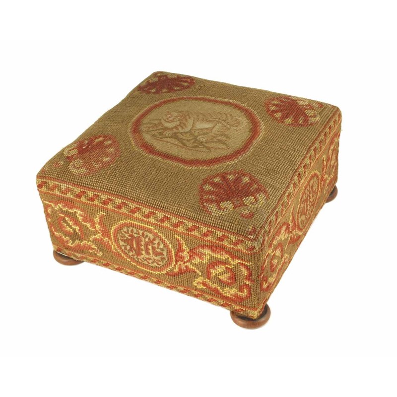 An early Victorian upholstered footstool, the centre with a circular panel of a tiger with scallops to the corners, the foliage frieze centred conch shells on later turned feet, 7.5in (19cm) h, 14.5in (37cm) w.