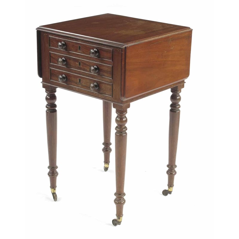 A Victorian mahogany work table, with a twin flap top above a cedar lined and divided frieze drawer and a deep drawer, the reverse with false drawers on brass castors, 29.5in (75cm) h, 18in (46cm) w closed, 17in (43cm) d.