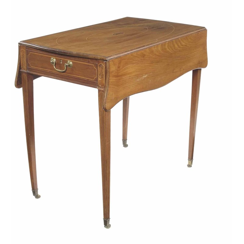 A 19th century mahogany Pembroke table, inlaid stringing and later burr yew panels, the moulded edge serpentine top above a frieze drawer, on square tapering legs and brass caps and roller castors, 27.5in (69.9cm) h, 30.75in (78cm) w, 18in (45.7cm) d.