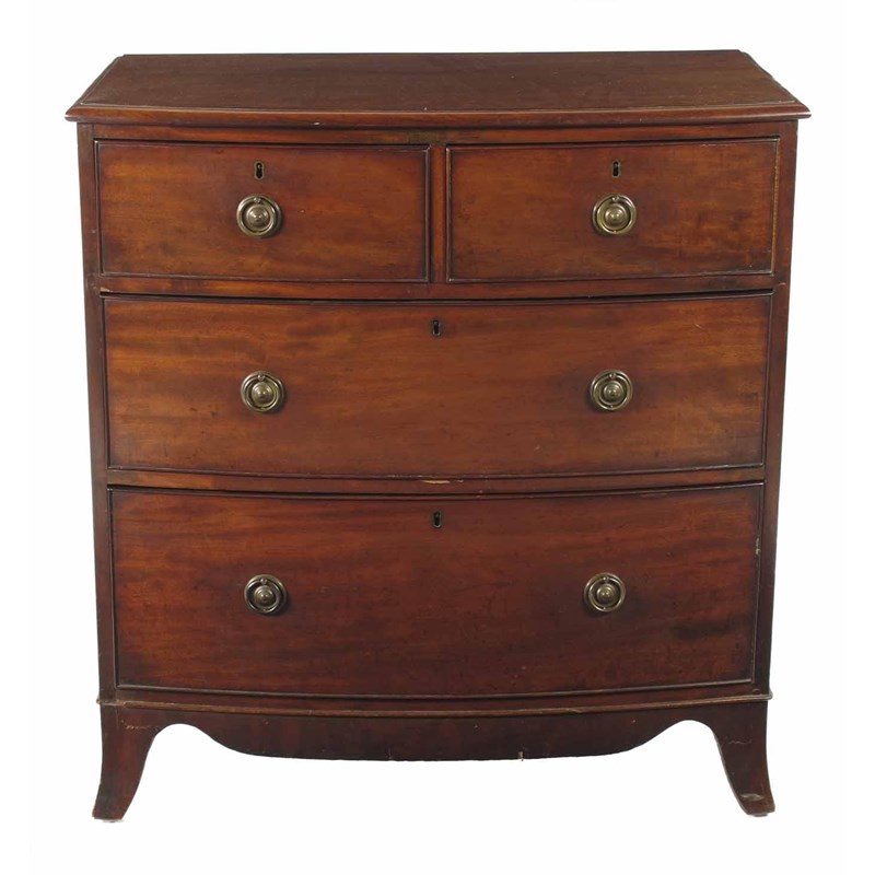 A Victorian mahogany bowfront chest, of two short and two long drawers, fitted later brass plate ring handles on splay feet, 35.75in (91cm) h, 34in (86.5cm) w, 20in (51cm) d.