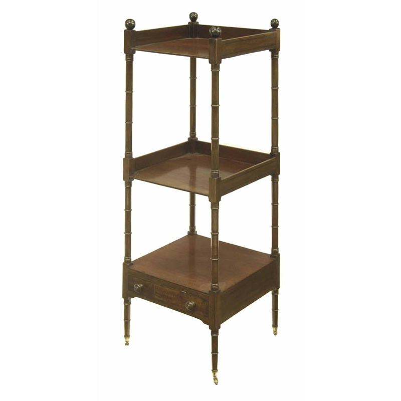 A Regency mahogany three tier whatnot, of tapering form, inlaid ebonised stringing with ring turned supports to a frieze drawer on brass castors, 48.75in (124cm) h, 17in (43.4cm) w, 17.5in (44.5cm) d.