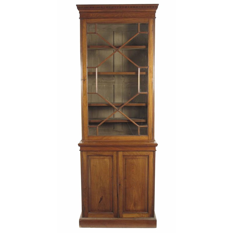 A late Victorian walnut bookcase cabinet, the dentil moulded cornice above an astragal glazed door enclosing four adjustable shelves, above a pair of panelled doors, one stamped 'T.WILLSON 68 GREAT QUEEN STREET, LONDON' enclosing two shelves, 90in (229cm) h, 31.5in (80cm) w, 15.5in (39.3cm) d. Section of moulding damaged to lower door.