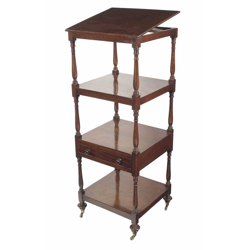 An early 19th century mahogany whatnot, with a hinged and ratchetted top with a bookrest, above three further tiers and a central drawer, on brass castors, 51.5in (131cm) h, 20.25in (51.5cm) w, 19in (48.5cm) d.