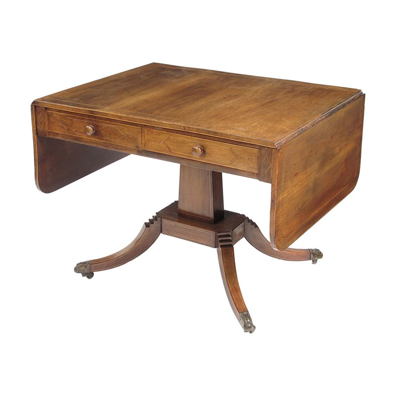 An early 19th century rosewood sofa table, inlaid two bands of stringing, above opposing real and false drawers, fitted turned wood handles, on a rectangular tapering stem and a canted platform with stepped top scroll legs, cast brass sabots and castors, 26.25in (67cm) h, 35.5in (90cm) w, closed, 27in (68.5cm) d. Restoration.