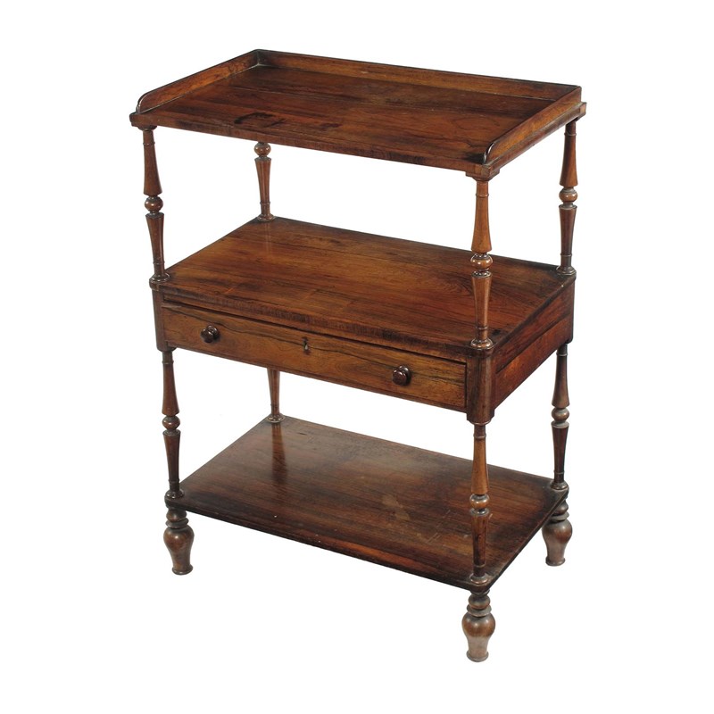 A George IV rosewood whatnot, the three quarter gallery top on turned supports to a central frieze drawer stamped 'M.WILLSON 68 QUEEN STREET', on later turned feet, 33.75in (86cm) h, 24in (61cm) w, 14in (35.5cm) d.