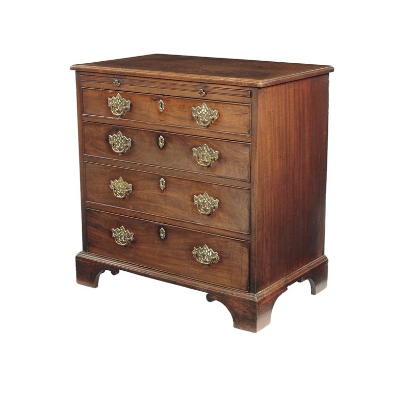 A George III mahogany gentleman's dressing chest of small proportions, the moulded edge top above a brushing slide and four long graduated drawers fitted replaced pierced brass handles, on bracket feet, 32.25in (82cm) h, 31.5in (80cm) w, 19.75in (50cm) d.