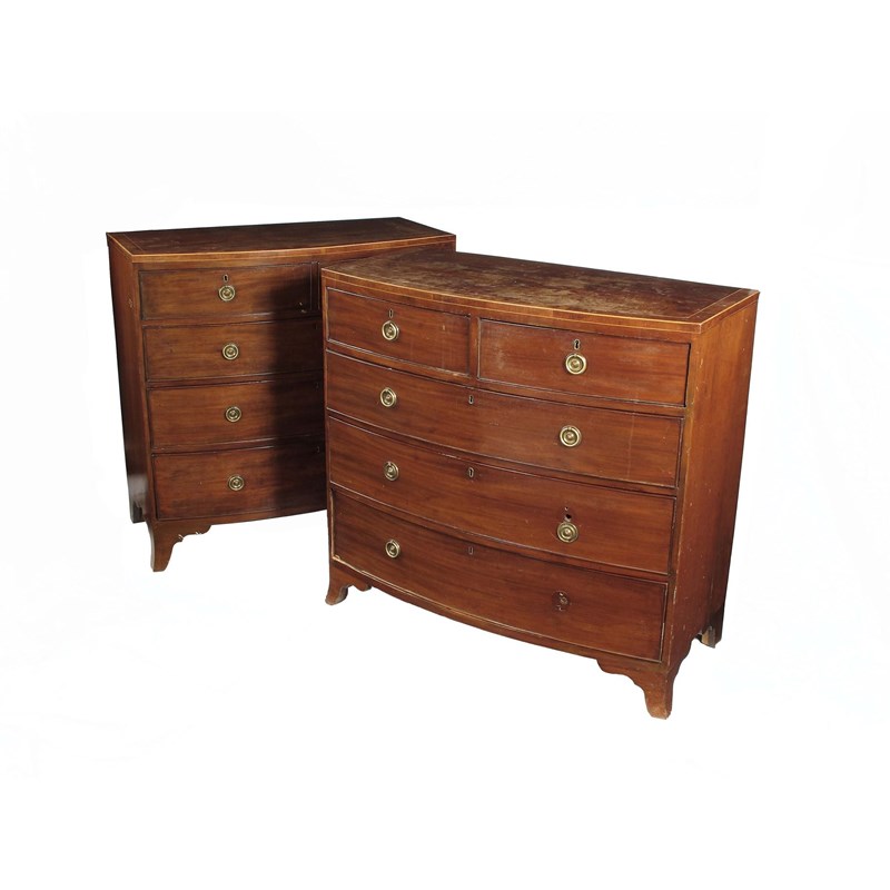A pair of early 19th century mahogany bowfront chests, with crossbanded tops inlaid stringing above two short and three long graduated drawers, fitted later brass plate ring handles, on splay bracket feet, 39in (99cm) h, 42in (107cm) w, 20.75in (53cm) d. (2)