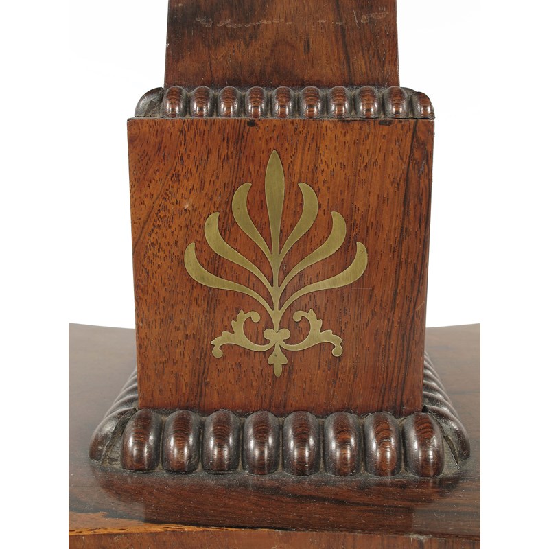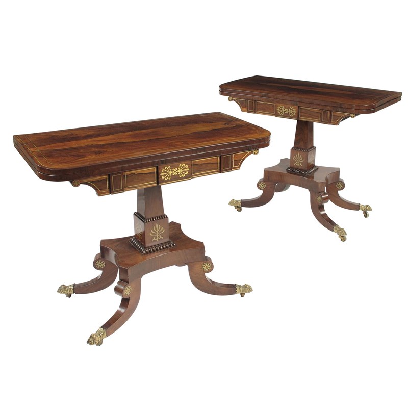 A pair of Regency rosewood and brass marquetry card tables, each with a swivel and fold over top inlaid stringing to a baize lined playing surface, above a panelled frieze centred a stylized palmette, the stepped square section stem with nulled mouldings and inlaid anthemion motifs, the platform base to hipped paterae headed downswept supports, on cast brass collared paw sabots and castors, 29in (73.7cm) h, 36in (91.4cm) w, 18.25in (46.3cm) d. (2)