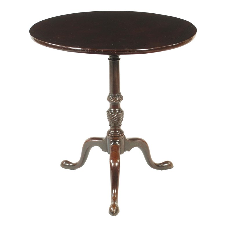 A George III mahogany tripod table, the circular tilt-top above a part spiral turned stem, 27.5in (70cm) h, 27in (68.5cm) dia. Top probably associated.
