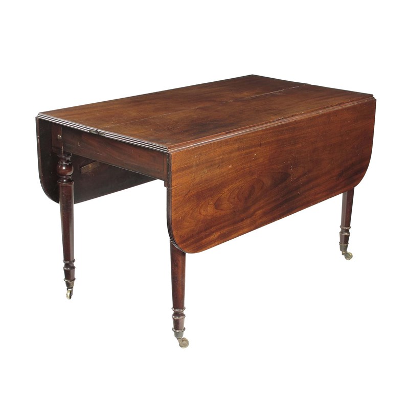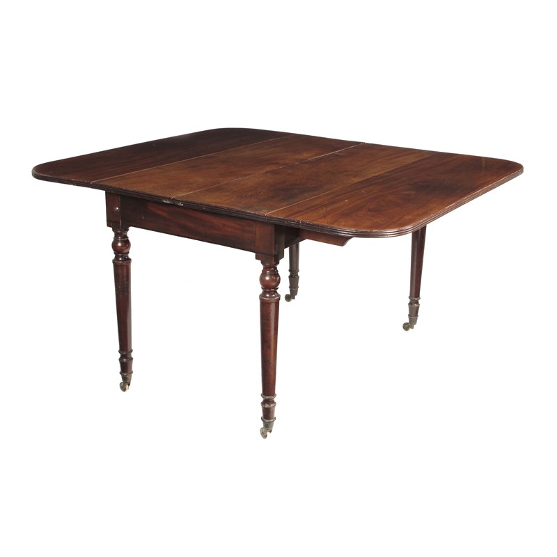 An early 19th century mahogany extending dining table, the reeded edge twin flap top on a telescopic frame, extra leaves missing, the frieze with ebonised stringing on turned legs to brass caps and castors, 28.75in (73cm) h, 84.25in (214cm) fully extended, 54in (137cm) open, 26.5in (67.5cm) closed, 48in (122cm) d.